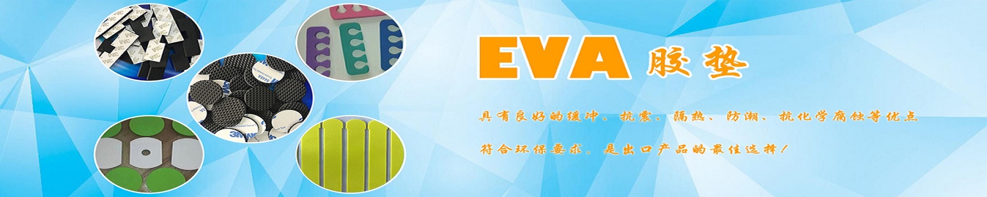 EVA产品:EVA片材、EVA垫、EVA胶垫、EVA脚垫、EVA泡棉、EVA海棉、EVA双面胶、EVA不干胶垫、EVA防滑胶垫,EVA防震脚垫、EVA垫子、EVA垫片、EVA垫圈、EVA工艺制品、EVA电子电器配件、EVA绝缘垫片、EVA盒内包装垫、高发泡、回力胶、高弹/防火/防静电EVA等